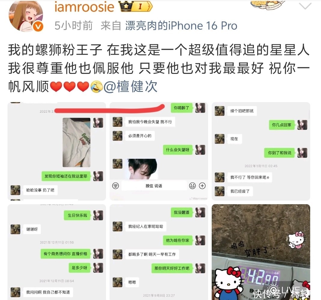 到了凌:05,她又将目标对准檀健次,公开二人微信聊天记录,亲昵称呼其为“我的螺蛳粉王子”。