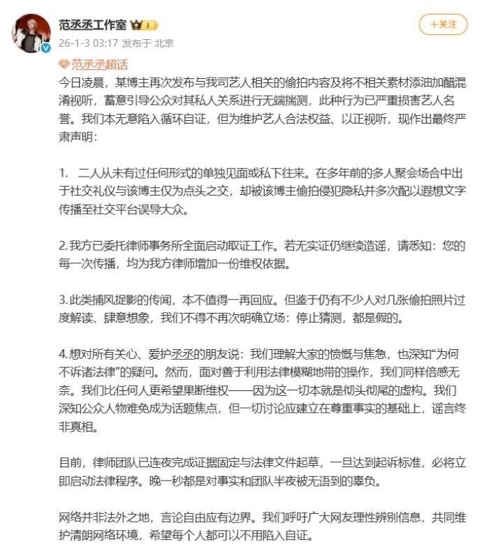 声明透露,团队已完成数十条帖文的证据固定工作,律师已介入,将依法追责。